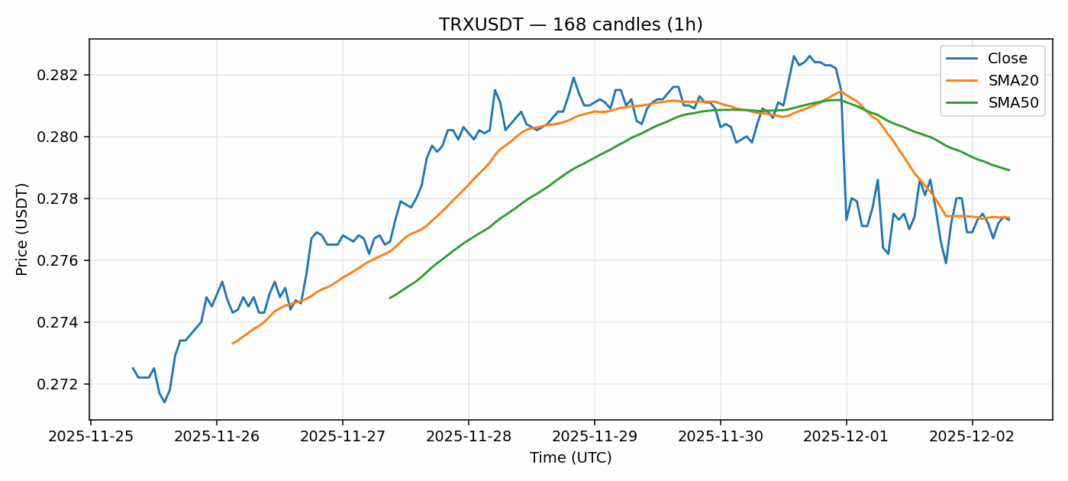 TRON — 1h candles, 7D window (SMA20/SMA50, RSI).