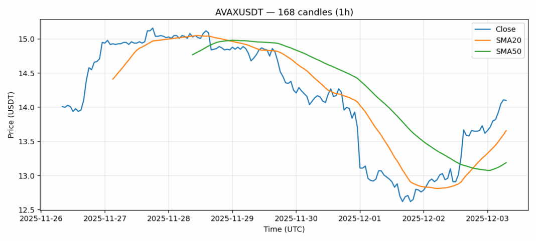 Avalanche — 1h candles, 7D window (SMA20/SMA50, RSI).