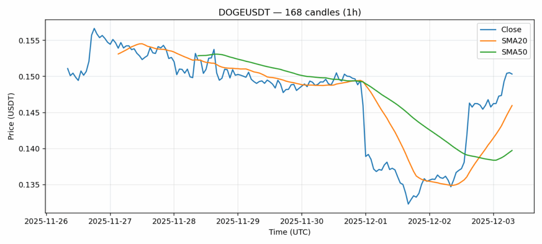 Dogecoin — 1h candles, 7D window (SMA20/SMA50, RSI).