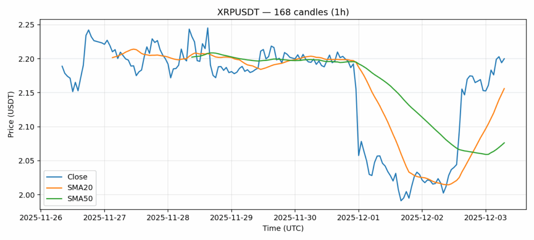 Ripple — 1h candles, 7D window (SMA20/SMA50, RSI).