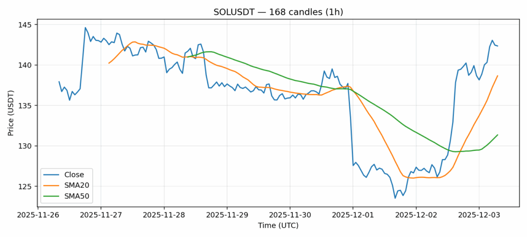 Solana — 1h candles, 7D window (SMA20/SMA50, RSI).
