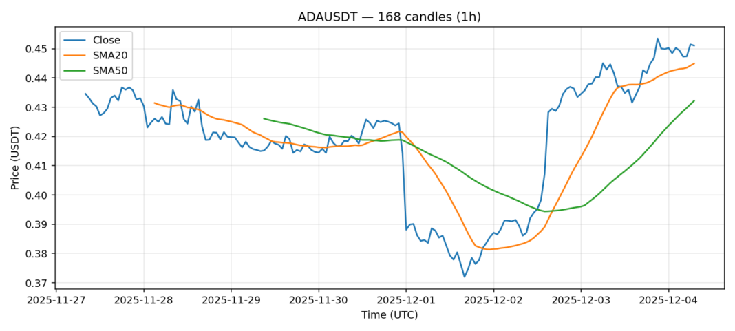 Cardano — 1h candles, 7D window (SMA20/SMA50, RSI).