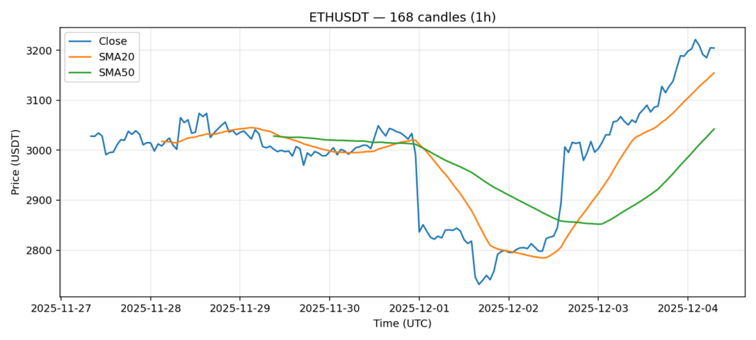 Ethereum — 1h candles, 7D window (SMA20/SMA50, RSI).