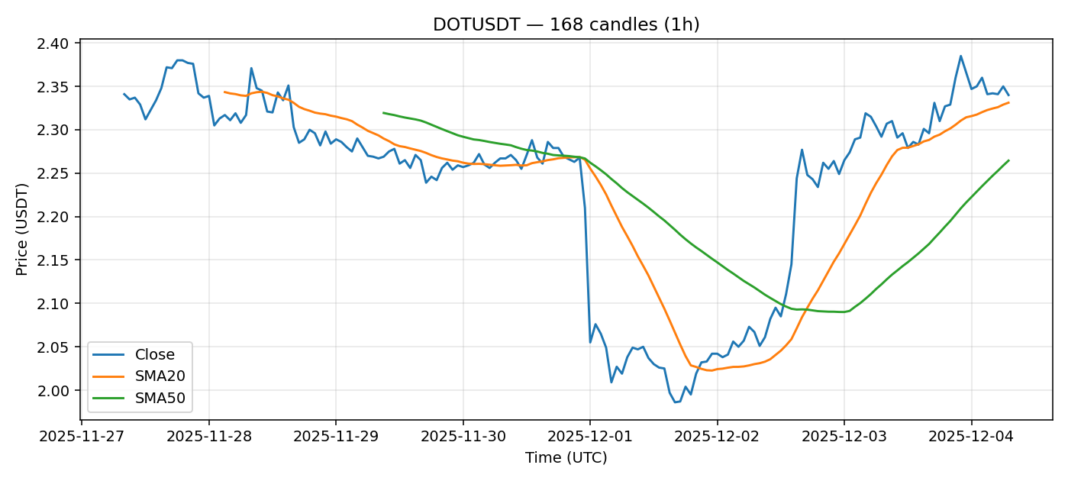 Polkadot — 1h candles, 7D window (SMA20/SMA50, RSI).