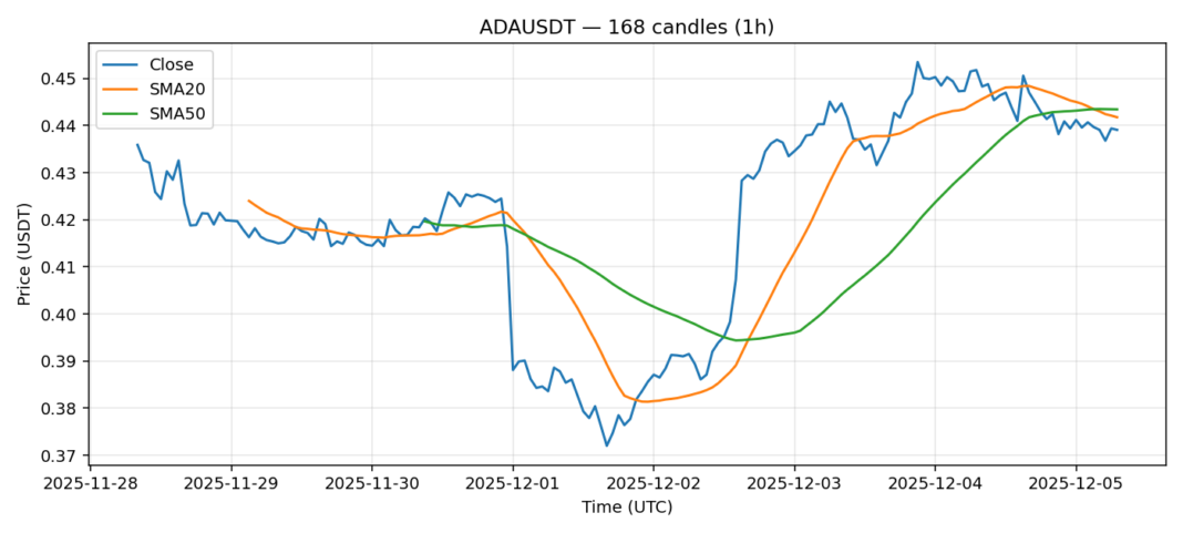 Cardano — 1h candles, 7D window (SMA20/SMA50, RSI).
