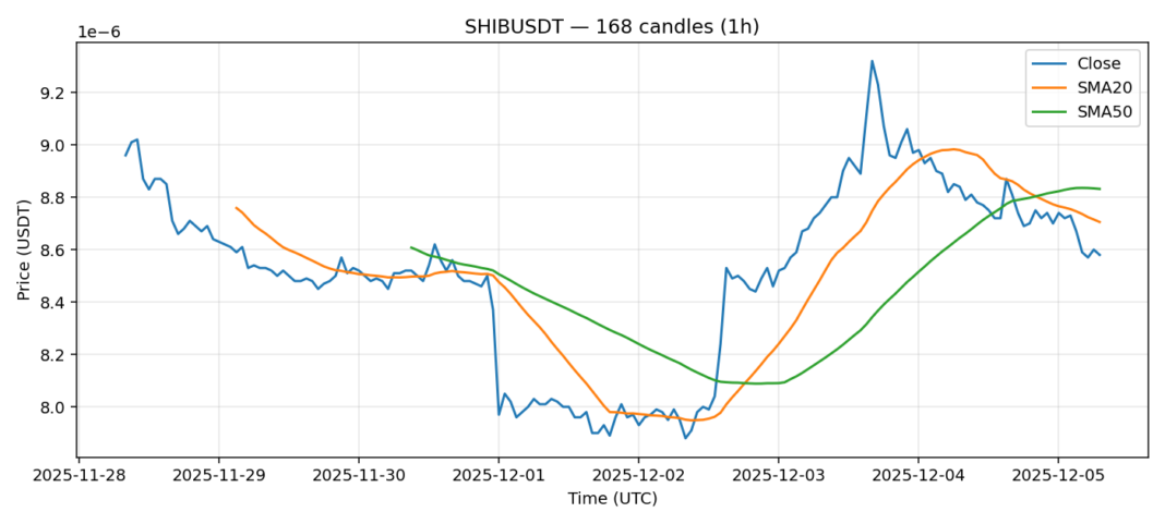 Shiba Inu — 1h candles, 7D window (SMA20/SMA50, RSI).